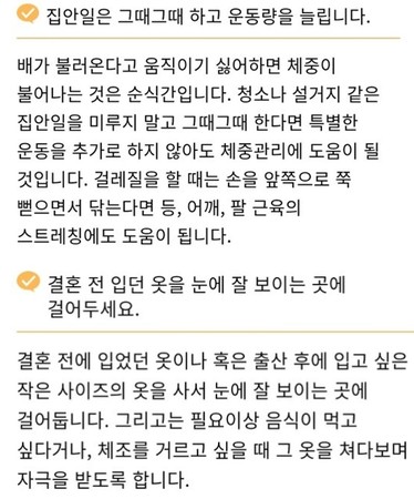 ▼除了上面這6點,指南還要求孕婦保持好身材。要求孕婦不能吃飽後不動,以免體重上升,而且要繼續做家事,如果每天都準時做好家事,不用特別去運動也能管理好體重。為了防止不知不覺間發胖,孕婦可以把婚前穿的,或生產後想穿的漂亮衣服放在顯眼的地方,以此為動力克制自己不要多吃不動。