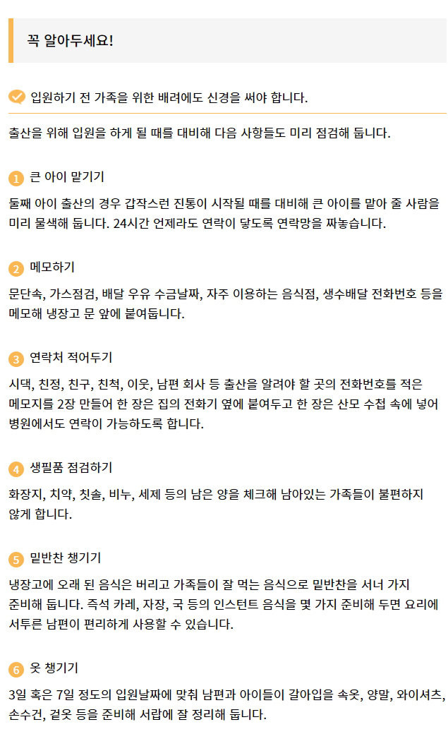 ▼首爾市懷孕生產資訊中心網站的「生命成長之懷孕」中,懷孕後期指南裡,「一定要知道」這一項的概要部分就說「住院待產前要替家人著想」。不僅如此,指南上還詳細列出了6項孕婦該為家人著想的指導做法: