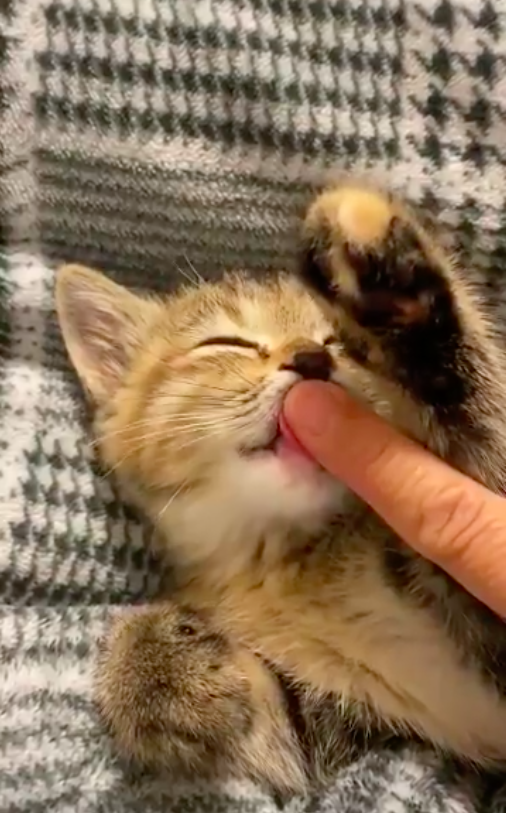 ▼這隻貓咪還很小,很有可能是因為還沒斷奶,所以才愛舔來舔去、把手指當成奶嘴了吧。