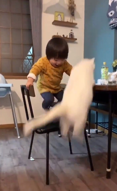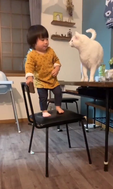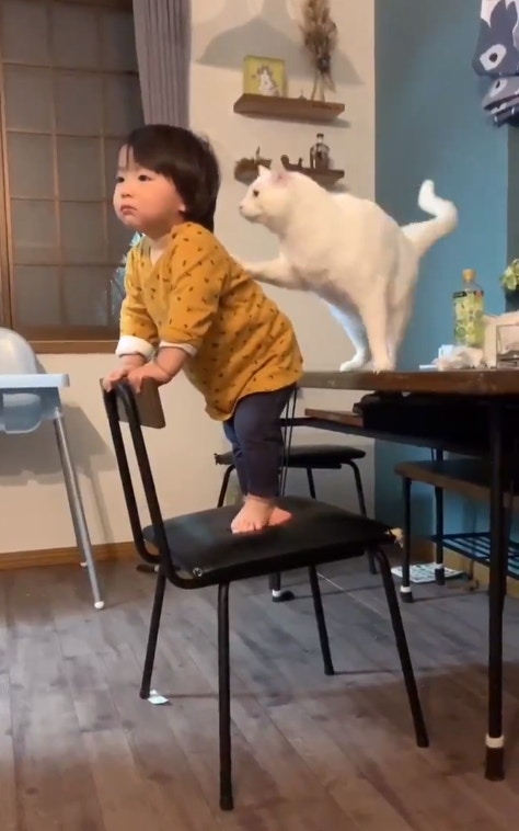 ▼活潑好動的小朋友調皮地爬上椅子,還準備再爬到飯桌上。家中的白貓保姆發現這件事也沒有閒著,而是立刻跑過來阻止。