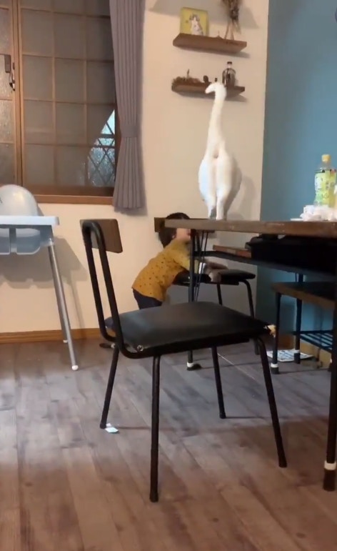 ▼白貓跳到桌子上,用身體擋住爬上桌的路線,還輕輕壓向小孩,請小朋友乖乖坐下。