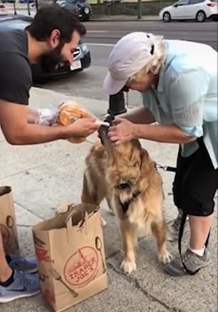 ▼當時Murphy正跟著老婆婆在散步。牠大概聞到了麵包的香味,直接把男子手中的麵包據為己有。主人和男子都讓牠鬆口,牠卻非常堅持。