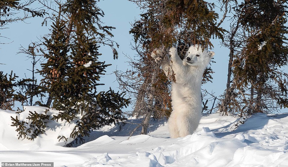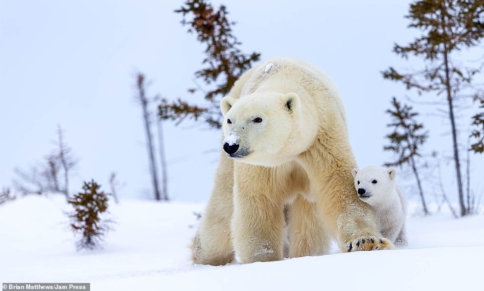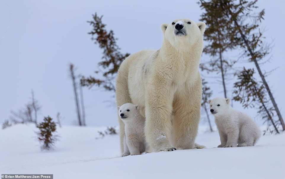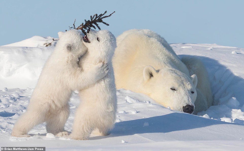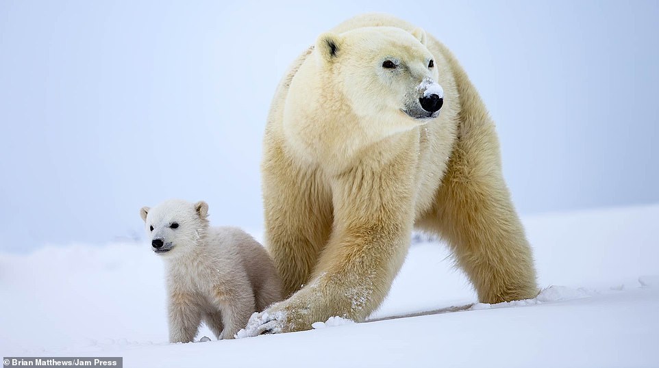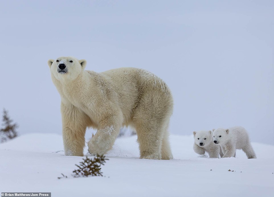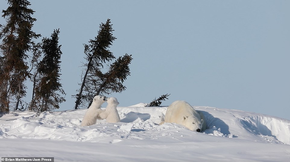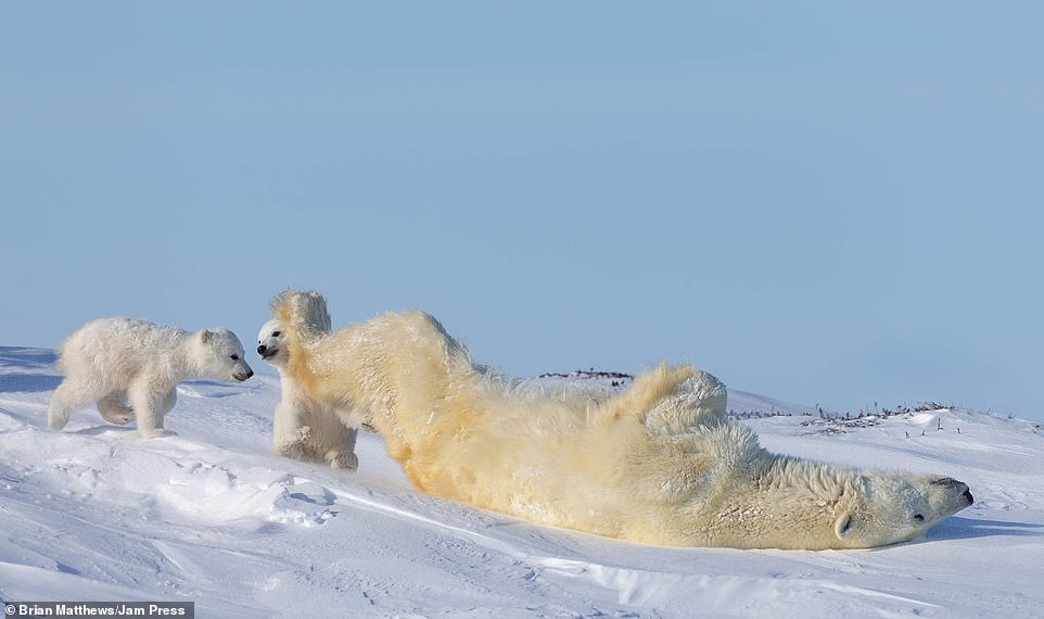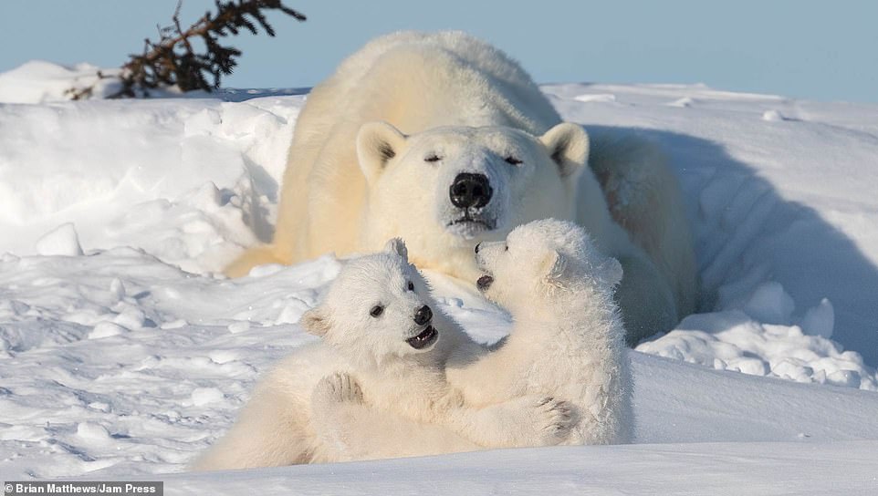2021年01月18日北極熊是地球上最大的陸地肉食動物之一。牠們生活在極地環境中,白色的外表在雪地中是最好的保護色。最近英格蘭達拉謨(Durham)42歲攝影師Brian Matthews和攝影團隊一起,在加拿大瓦普斯克國家公園中拍到了一組有趣的照片。北極熊媽媽帶著2隻小熊在雪地中嬉戲玩耍,那畫面看起來非常有愛。