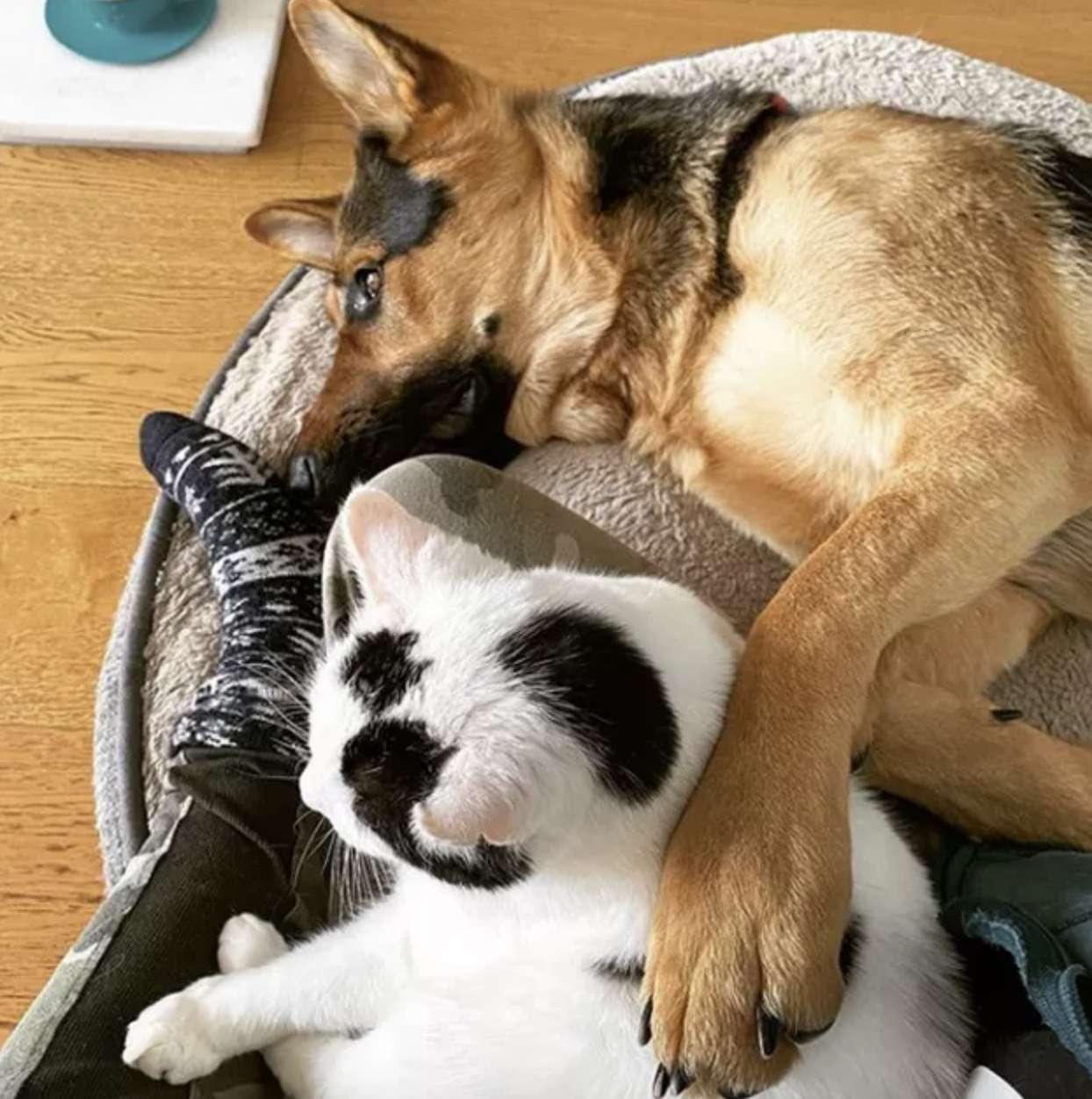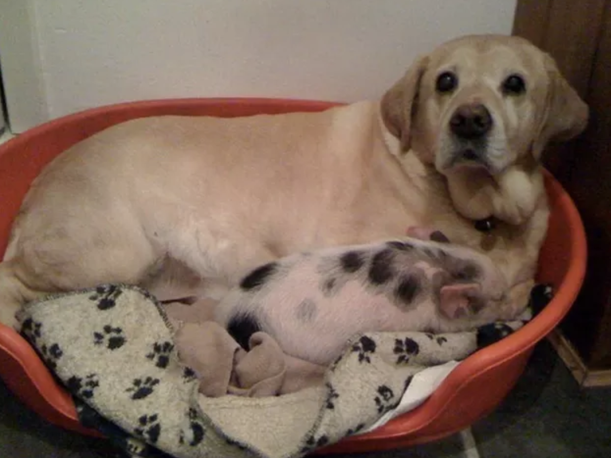 ▼狗狗和豬豬一起午睡。