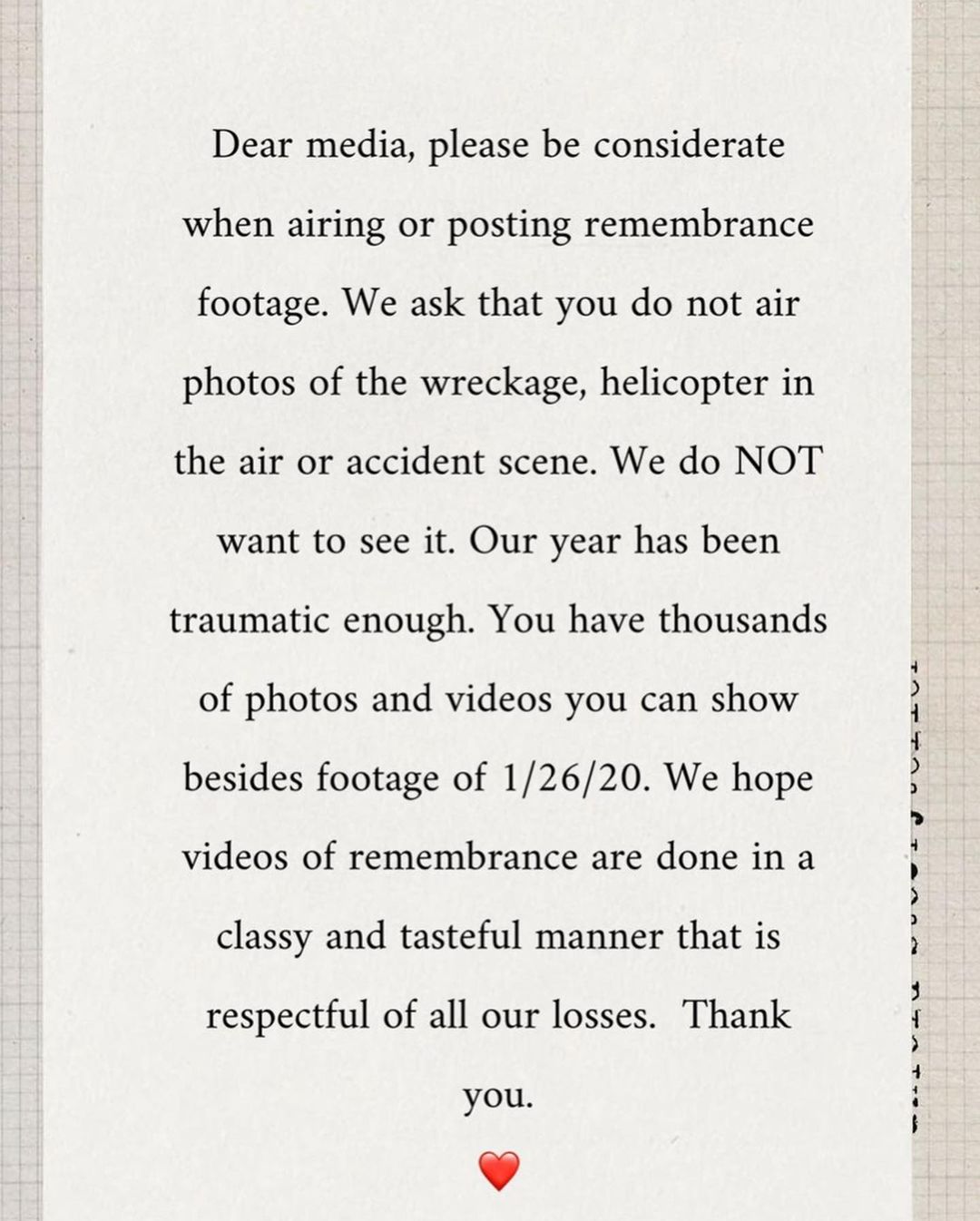▼布萊恩的忌日很快就要到來,凡妮莎特別給媒體寫了一封信,po在IG上:「親愛的媒體朋友們,若要紀念柯比的話請慎重考慮報導中用到的照片或影片,拜託不要再傳播直升機殘骸或空難現場照片。我們不想再看到這些,過去這一年來,已經夠痛苦了。」