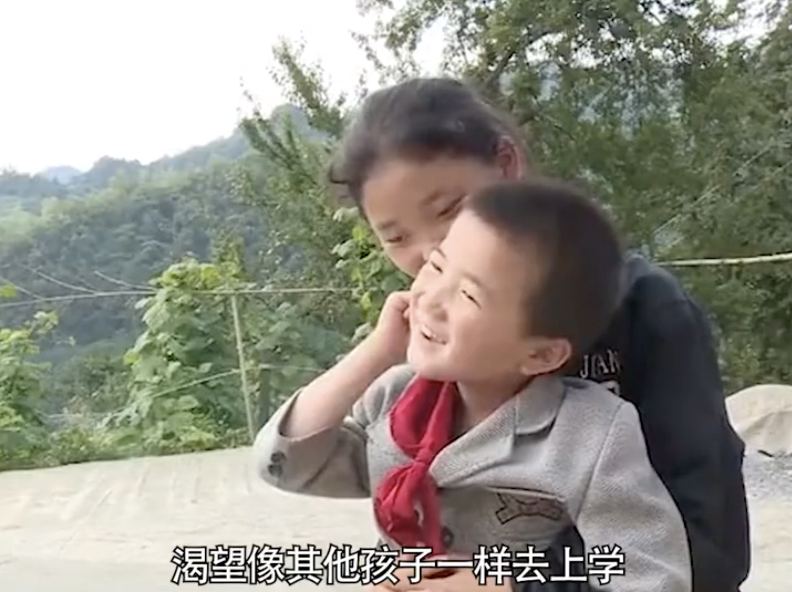 ▼羅薇的家距離學校非常遠,行走困難的弟弟無法自己去學校,所以一直輟學在家。羅薇看到弟弟渴望像其他孩子一樣去上學,就決定背起弟弟,踏上求學的道路。不管在家裡還是在學校裡,羅薇都把弟弟照顧得非常好。