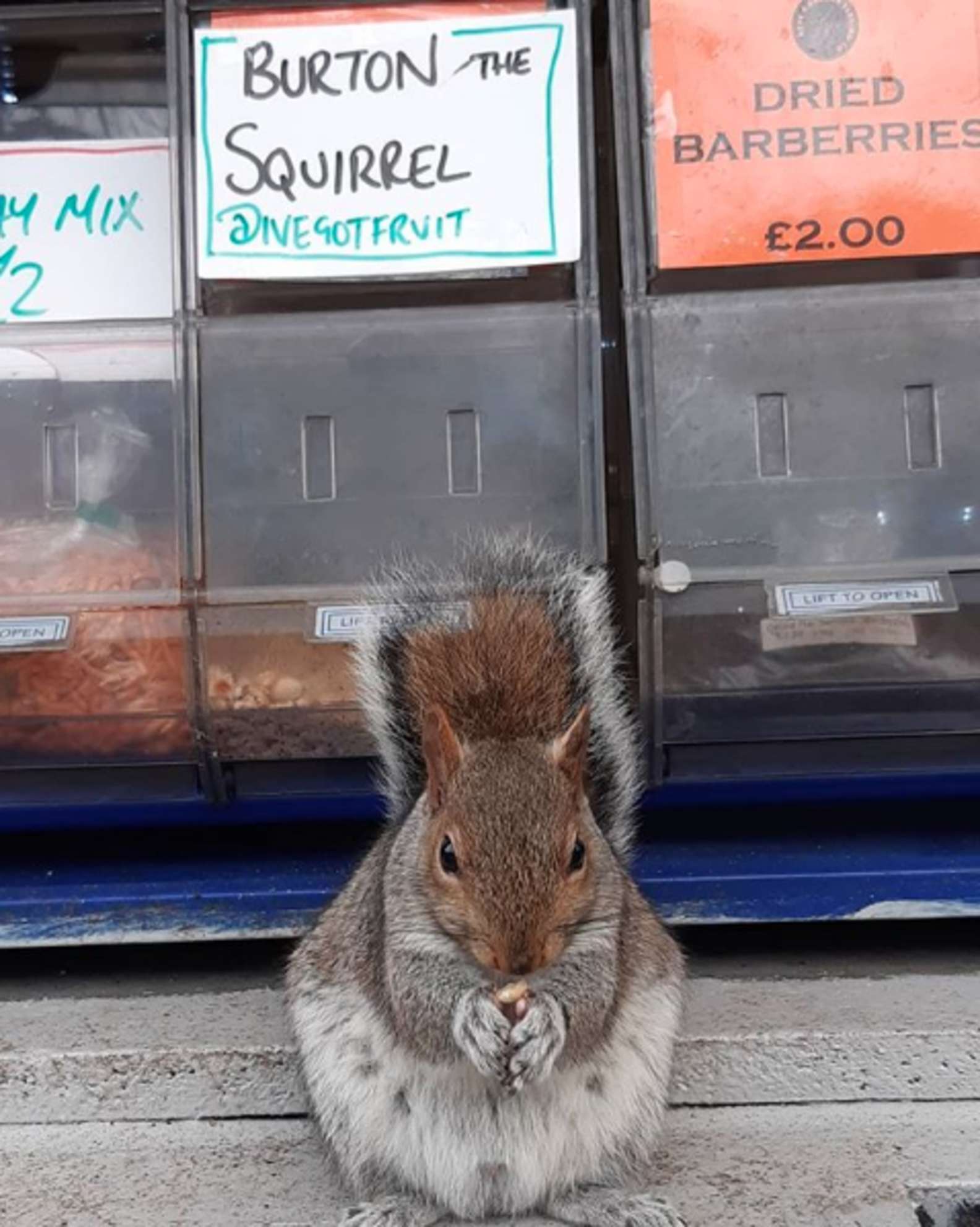 ▼只見這隻小松鼠蹦蹦跳跳來到攤位前,公然從櫃子裡撈走一把堅果。那個櫃子上寫著「Burton/THE SQUIRREL@ivegotfruit」。店主為小偷松鼠設置了一個專屬的小抽屜,還為牠設立了一個IG帳號,經常紀錄牠跑來偷吃堅果的愜意日常。