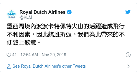 ▼在事發後,荷航也特別公開致歉。波波卡特佩特山是世界上地表運動最活躍的地區之一,一整年都沒有休止期。11月就曾經噴出大量煙灰,讓天空佈滿灰塵。
