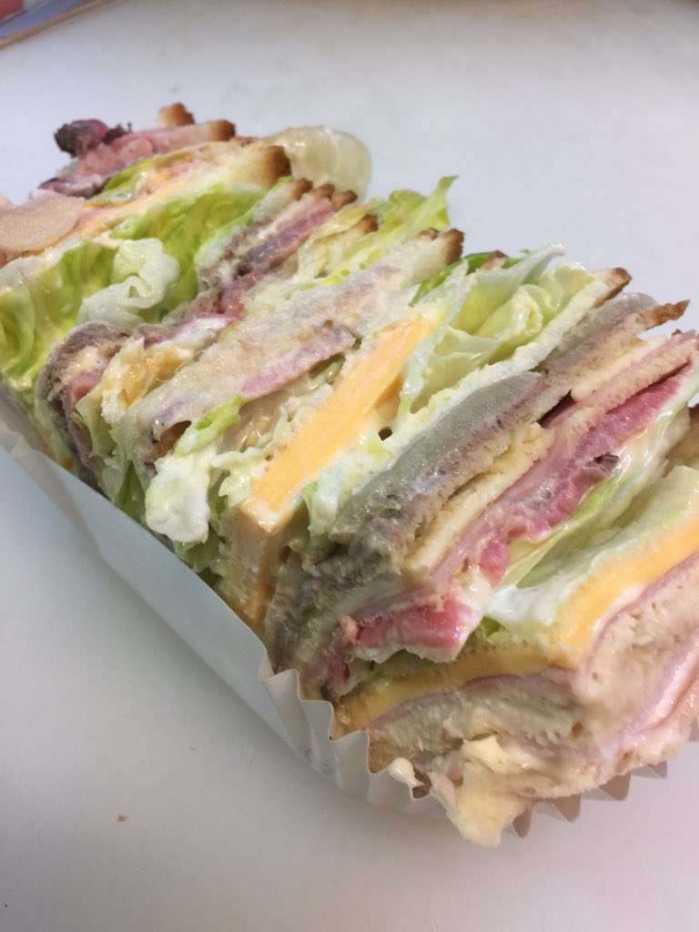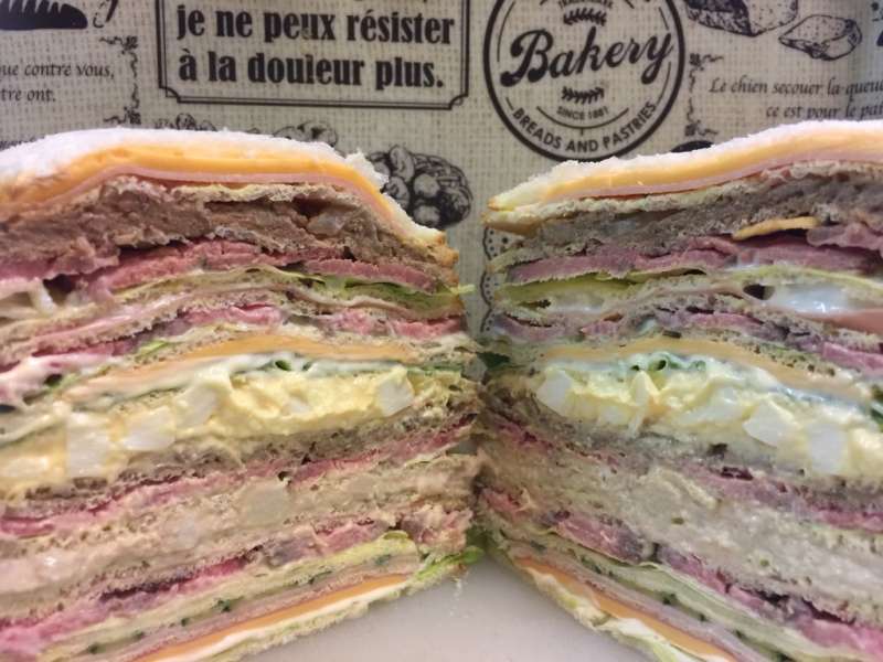 ▼他使用的手動切片器所能設定的最薄厚度是2mm,成功把半條吐司切成47片,並且塗上奶油堆疊起來做成了三明治。