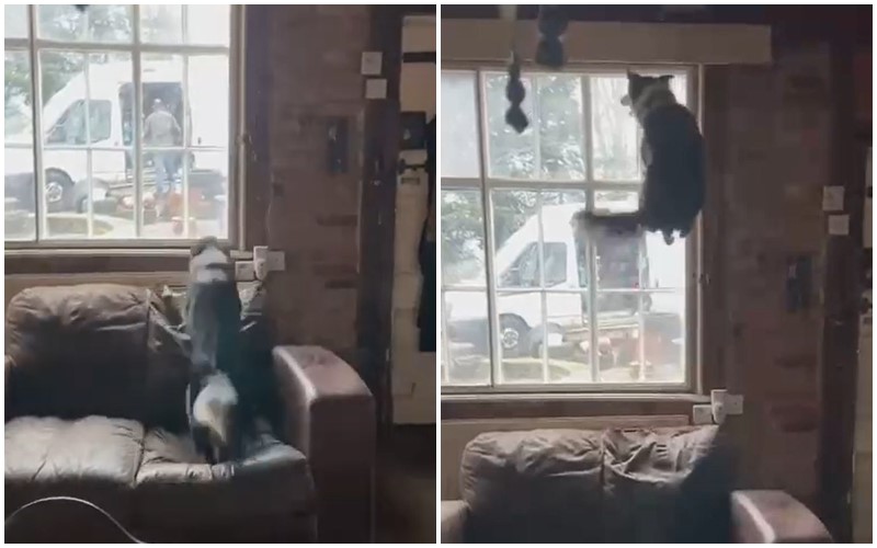2021年01月25日這隻狗狗的彈跳能力太強了!英國有一隻叫Echo的2歲邊境牧羊犬,牠平時就活潑好動,喜歡被關注,每次窗外有人經過牠都表現得很興奮。那天把拔John Glover在門口搬東西,屋裡的Echo透過窗戶看到把拔,在沙發上激動地蹦蹦跳,牠歡快的模樣很好笑。