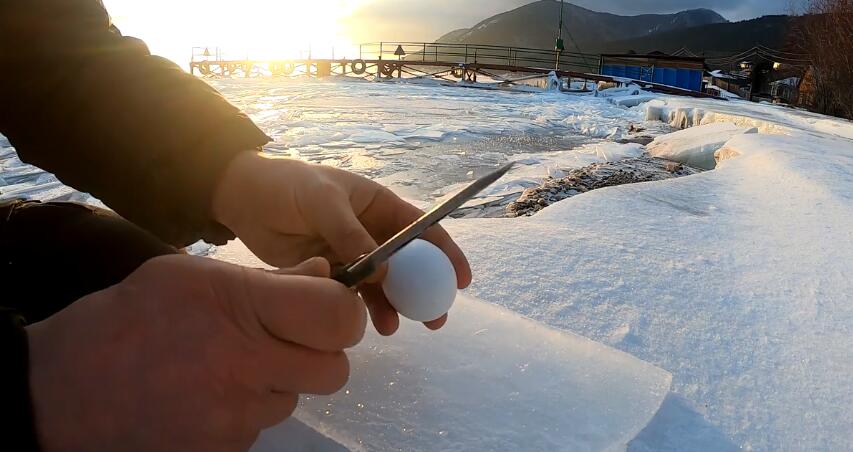 ▼這名男子來到貝加爾湖畔,在-30°C的室溫下,湖面已經完全結冰。男子將一顆雞蛋敲在一塊碎冰塊上,當蛋液落在冰塊上,很快開始流動,但是不到10秒鐘的時間就被凍住了。