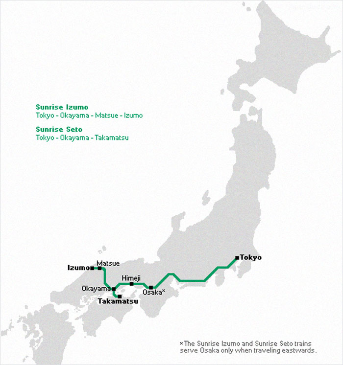 ▼列車從高松或出雲回程往東京時,會加停大阪,因此遊客也可以選擇晚間在大阪上車,在隔天早上就抵達東京。