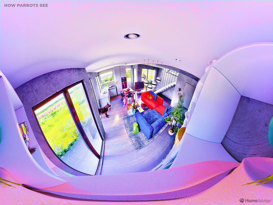 ▼鸚鵡視角:鳥類在日常生湖中非常依賴牠們高效的視覺系統,鸚鵡可以看到紫外線、藍色、綠色、紅色等等。其實圖片中的紫色部分就是鸚鵡能看到的紫外線,而人類是看不到的。鸚鵡還能夠超快速調整焦點,牠們有近300度的視野範圍,還有單眼視覺,這就意味著鸚鵡可以一隻眼睛聚焦事物上,而另外一隻眼睛看著其他的東西。牠還可以隨意收縮瞳孔,比如當牠不喜歡主人的新燈罩時。