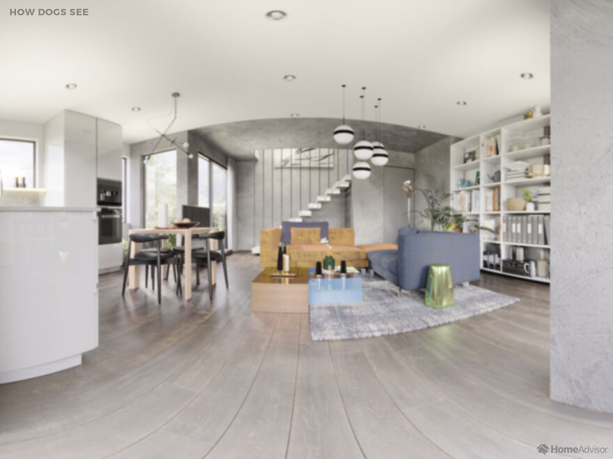 ▼這是狗狗看到的樣子:不管你家裡是什麼裝潢風格,在狗狗的眼中都會呈現柔和的海洋風格,這是因為狗狗的視錐細胞,會過濾掉一些色彩,牠們的眼中主要能感受到的是藍色和黃色。