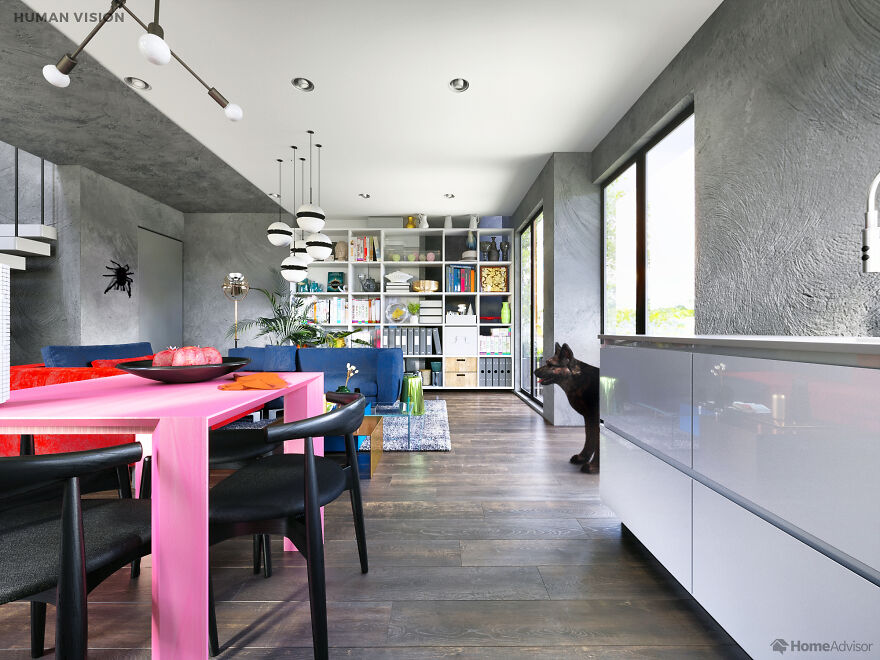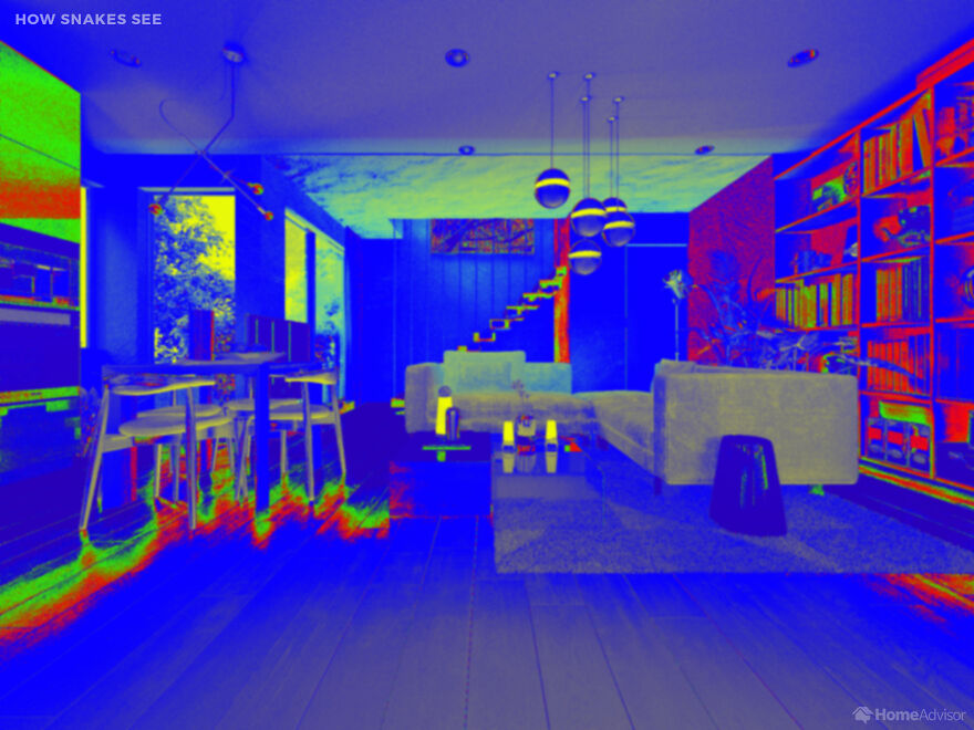 ▼蛇的視角:如果你家有養寵物蛇,那麼你可以不用考慮裝潢風格對牠的影響了,因為蛇的視力在白天非常差,根本看不出你的配色品味等,不過在夜晚會好很多。蛇的熱紅外感覺器官,能夠將熱探測數據與感官相結合,創建出類似熱成像的畫面。