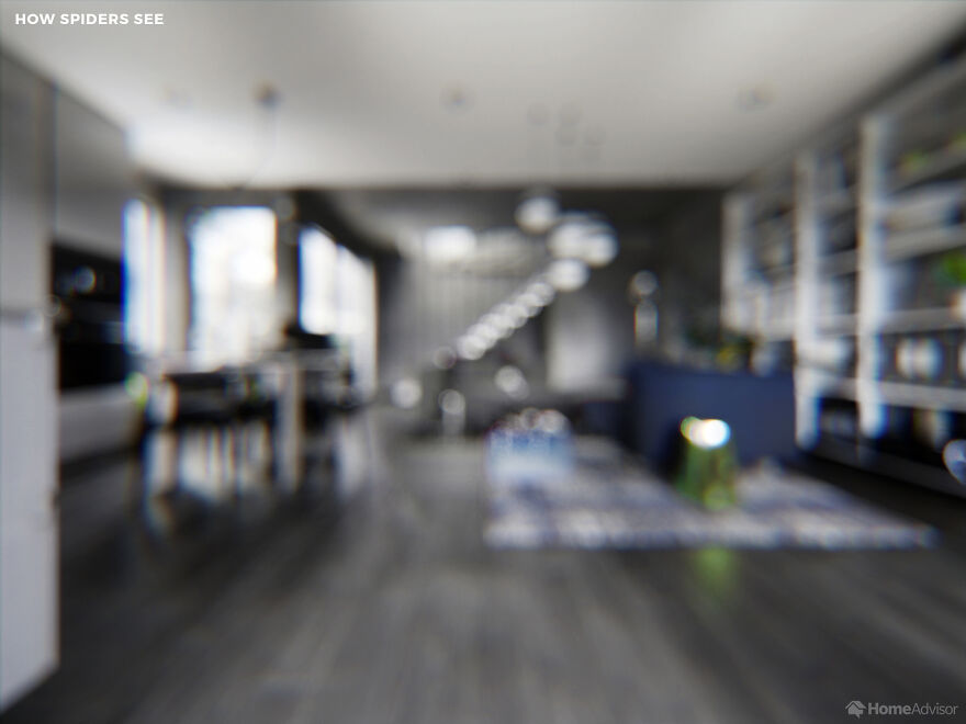 ▼蜘蛛視角:蜘蛛有8只視力微弱的眼睛,相比用眼來看,他們更多的是依靠毛茸茸的腿來感知周圍的環境。不過最近研究發現,蜘蛛的視蛋白可能增強牠們對色彩的敏感度,也可能是用來尋找伴侶。