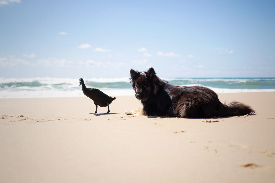 2021年01月28日我們看到過不少動物之間跨物種的友誼,在業餘攝影師Natacha家裡,就有德國牧羊犬Vendetta,印度跑鴨Lemony,還有兩隻鴿子Grisella和Heldig,奇妙的是,牠們都是親密無間的好朋友,一起出鏡時如童話般美好的畫面總是能夠融化人心!