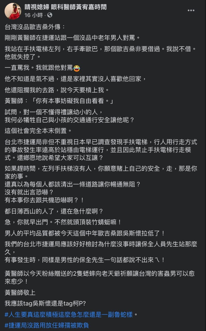 ▼黃宥嘉又說:「如果趕時間,左列手扶梯沒有人,你願意賭上自己的安全,走,那是你家的事。還真以為每個人都該清出一條道路讓你暢通無阻?」後來有保全前來調解,但也沒有認真處理這件事,「我們的台北市捷運局應該好好檢討,為什麼沒事時讓保全人員先生站那麼久,有事發生時,同樣是男性的保全先生一句話都說不出來!歸根究底就是台北市的婦孺沒有受到重視與更安全的對待!」