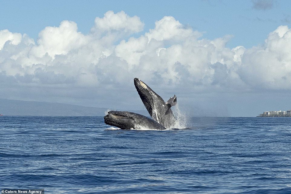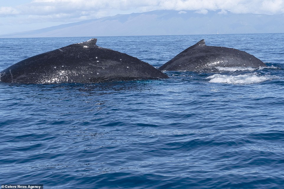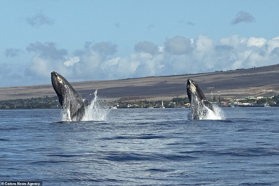 ▼這兩隻座頭鯨在水下互相追逐,又幾乎同步出現在茂宜島海岸附近,同時躍出水面。牠們的動作神同步,兩隻海洋巨獸同時出水,這一幕非常不可思議。