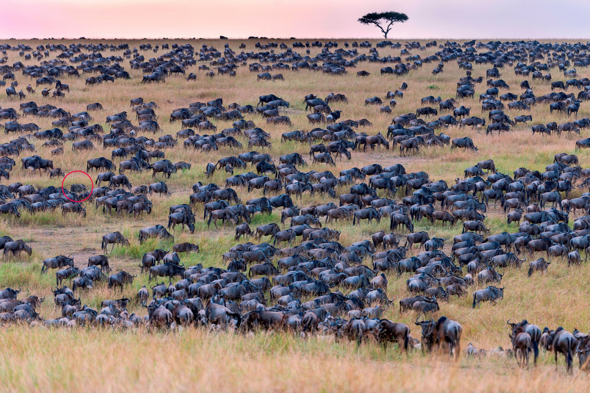 大自然給的眼力大考驗! 上萬隻牛羚低頭吃草「1隻斑馬」卻完美融入:沒人發現偶