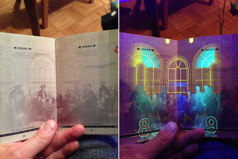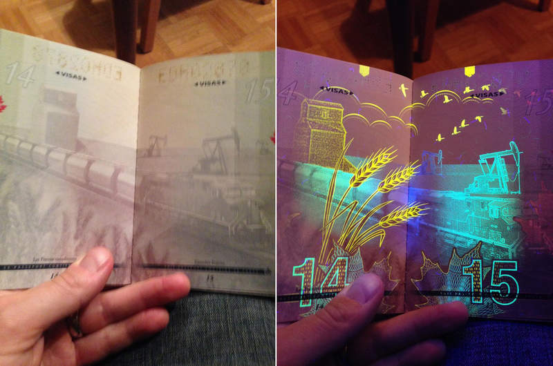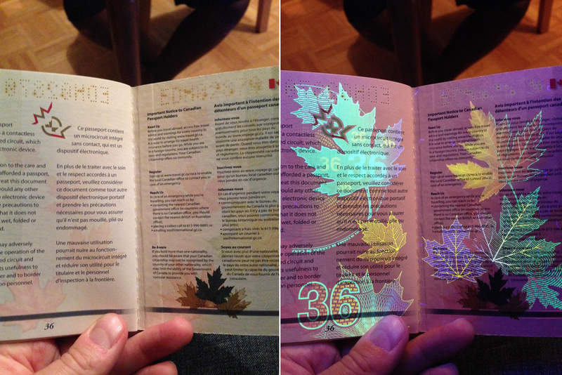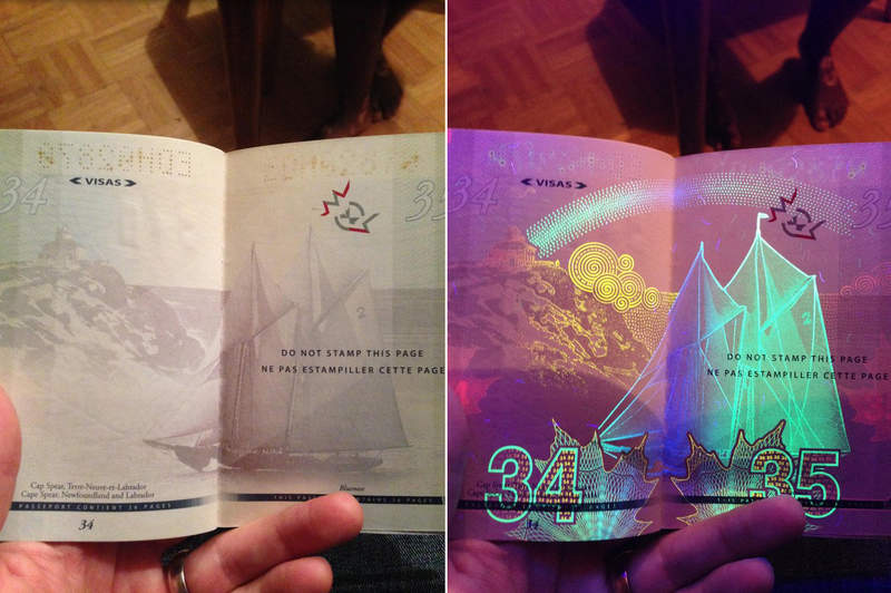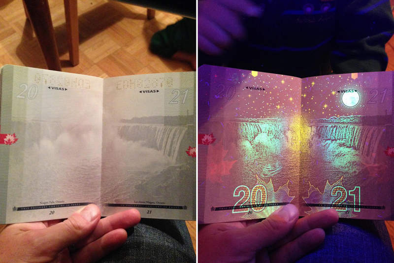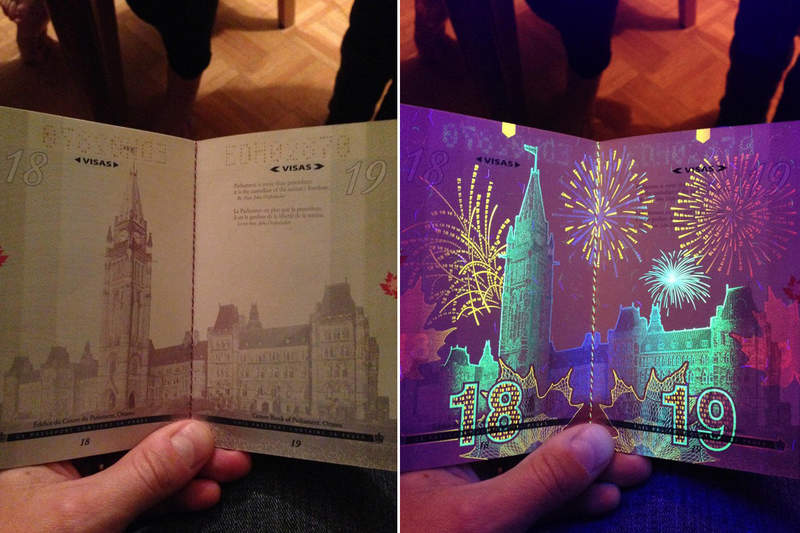 ▼這是2013年的加拿大護照上的防偽螢光線,用紫外線燈一照,原本平平無奇的護照突然煥發出別樣的色彩,那精彩的畫面驚艷了不少人。沒想到證件的設計也能那麼繽紛!