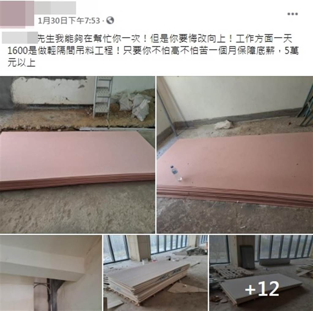 ▼陳先生透露,他曾經幫5寶爸照顧二女兒長達3年,對方非但不感激,還反控他誘拐。雖然他對5寶爸觀感很差,但實在心疼孩子們的狀況,所以還是願意再給對方一次機會。他在個人臉書發文說:「我能夠再幫忙你一次!但是你要悔改向上!工作方面一天1600是做輕隔間吊料工程!只要你不怕高不怕苦,一個月保障底薪5萬元以上。」