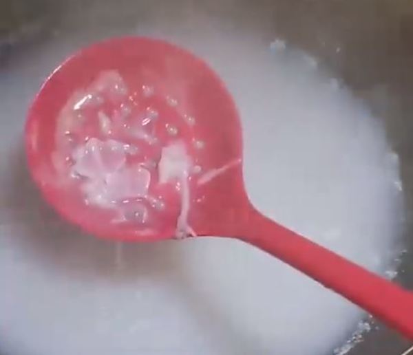 ▼結果兩尾魷魚在滾水中煮了5分鐘「溶化」成了渣,鍋裡的水變成了白色。到8分鐘的時候,鍋裡的魷魚已經不見了,只剩下粉紅色的湯。