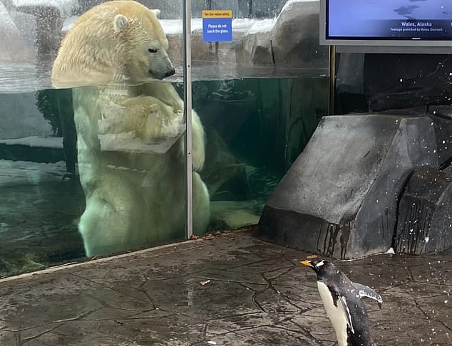 ▼動物園中這7隻企鵝的老家在南極,飼育員帶牠們去參觀來自北極的北極熊Kali。這兩個物種在野外永遠都不會相遇,這是牠們第一次見面。