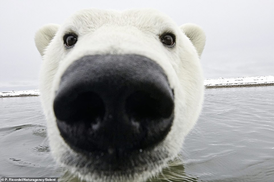 ▼攝影師將相機安置在桿子一端,握著另一端,讓相機盡可能地接近北極熊。當時他跟北極熊之間的距離只有2公尺左右。北極熊對相機很好奇,靠近鏡頭去聞嗅,牠還張開嘴巴去咬相機,幸好攝影師及時將相機拿走了。