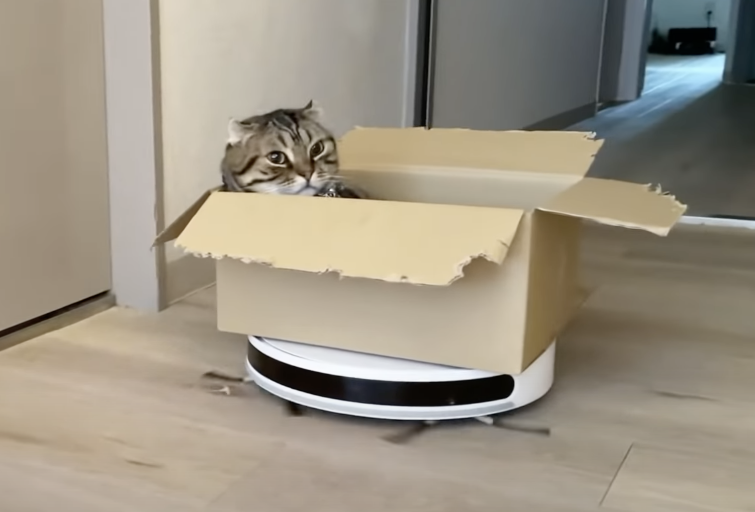 ▼機器人突然轉向,紙箱落下來,貓咪直接跌落在地,那一瞬間貓咪的表現超可愛。