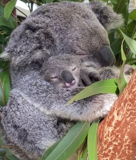 ▼從她最近分享的一段影片中可以看到,一個陽光和煦的午後,無尾熊母子依偎在樹上。無尾熊媽媽溫柔抱著寶寶,小無尾熊像娃娃一樣窩在媽媽懷裡,閉著眼睛沈沈睡著。牠的臉上還掛著淡淡的笑容,一看就知道非常安心、非常平靜。