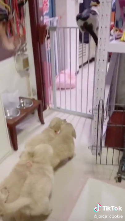 ▼貓咪跳出圍欄後,金寶寶們的爸媽走了過來。牠們看到落荒而逃的貓咪,似乎在說:「現在你知道照顧小孩有多辛苦了吧,都是一家人,以後也拜託你多跟小狗們玩一下~」