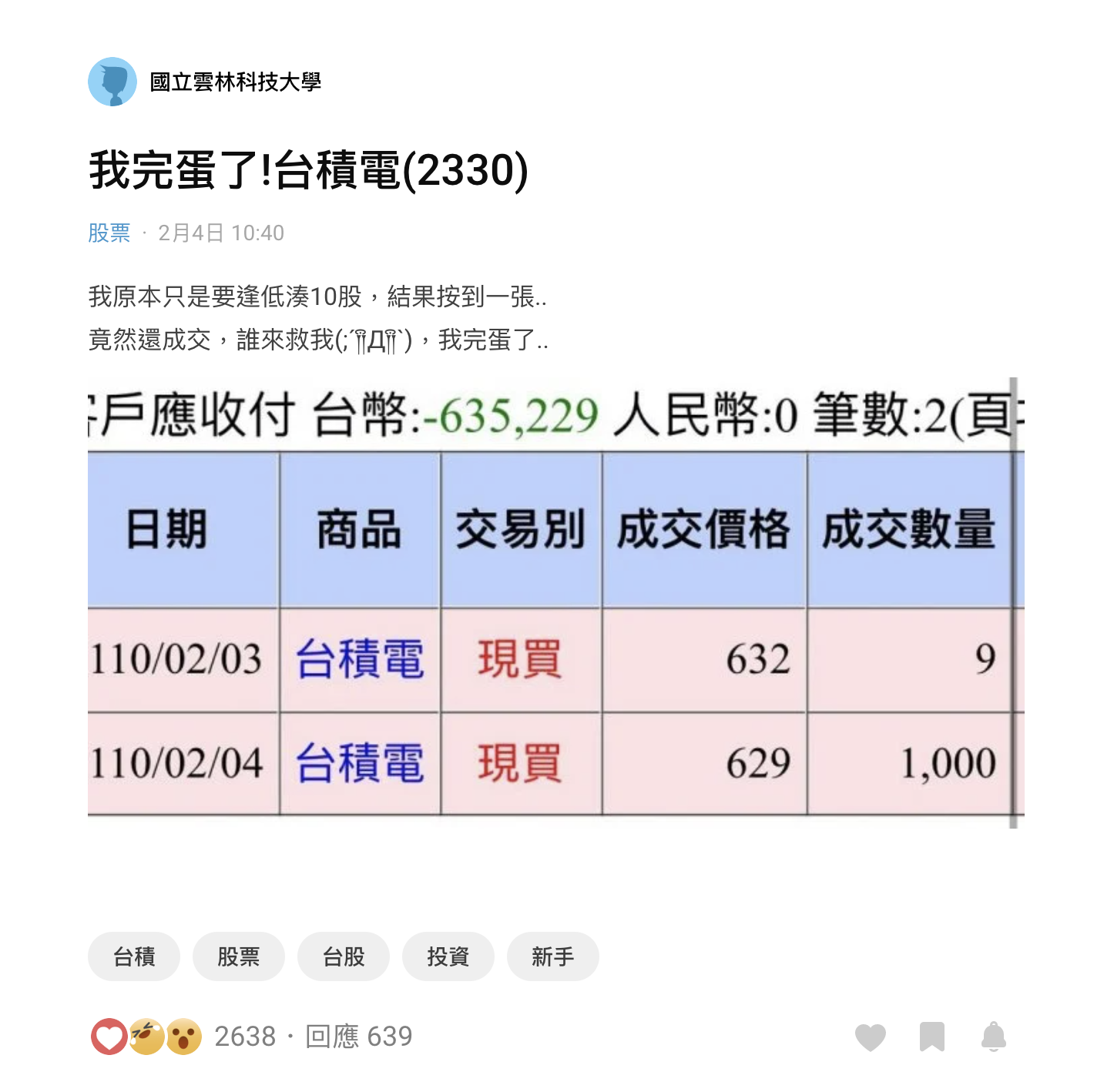 2021年02月09日「護國神山」台積電吸引很多人投資。先前台積電股價衝過600元大關,持續飆漲到679元創下新高,然後開始下跌。一名男大生想趁台積電股價逢低湊10股,卻不小心把1股按成1張,而且還成交了。他崩潰求助:「誰來救我,我完蛋了…」