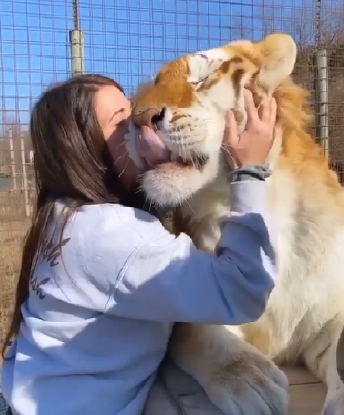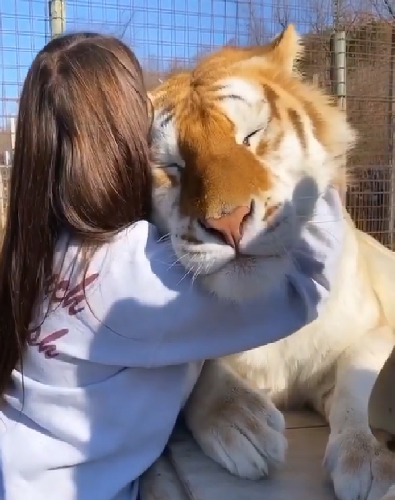 ▼老虎的體型非常大,腦袋比女生的頭大一倍。牠動作很放鬆,輕輕將頭靠在女生的肩膀上,那溫柔的模樣根本不像我們在自然紀錄片中看到的兇猛老虎。女子給了老虎一個大大的抱抱,老虎露出奶憨奶憨的表情。