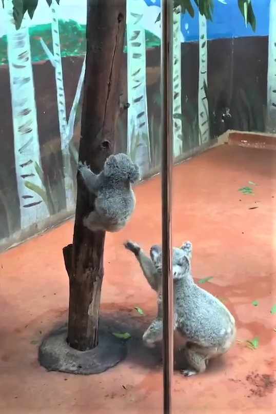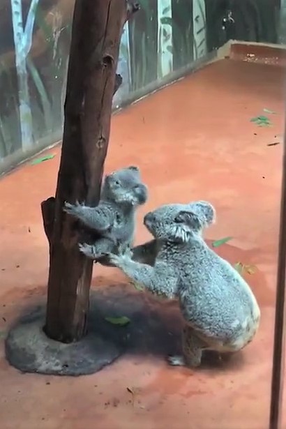▼攀在樹上的無尾熊寶寶不敢下樹,牠頻頻往下看,動作遲疑、非常緩慢。旁邊的無尾熊媽媽注意到小孩的緊張,連忙過去幫忙。牠一手扶著樹,另一隻手溫柔扶著小孩的PP。