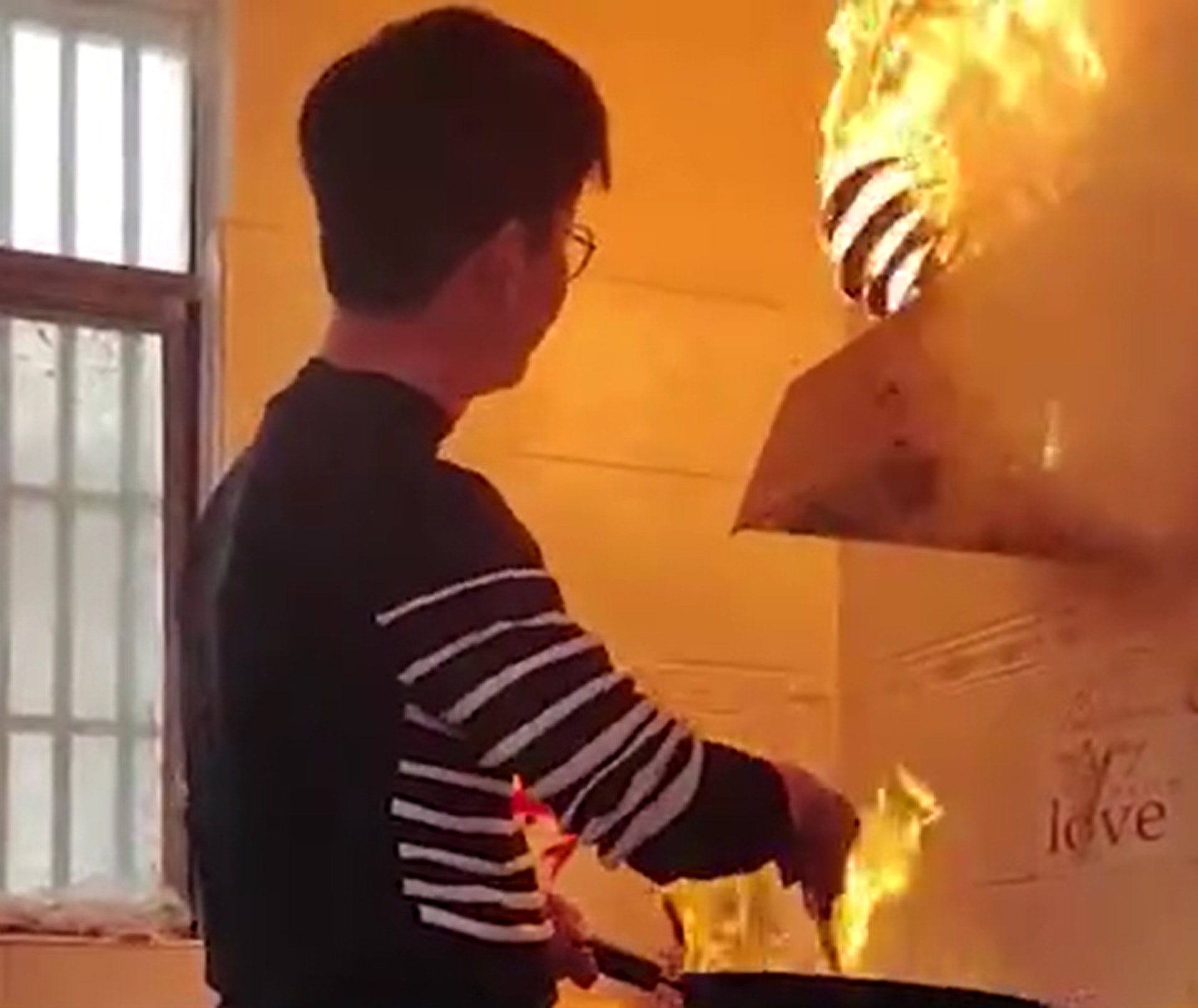 ▼從影片中可以看到,這名男子正在廚房中炒菜。鍋裡的火勢非常猛烈,但他的表情很冷靜,似乎一切都在掌握之中。正當大家想為他的高超廚藝鼓掌時,火勢竟越來越旺,巨大的火焰點燃了抽油煙機的管道,一時之間濃煙四起,組件燒到甩掉,整個廚房變成了災難現場。
