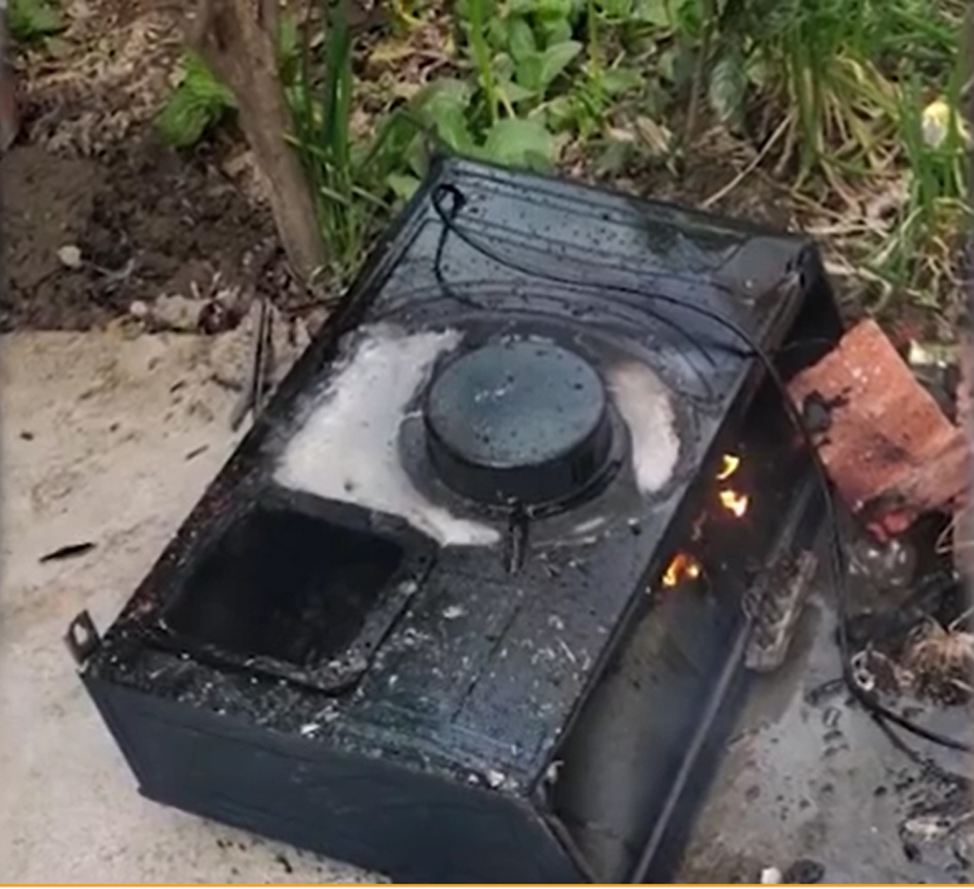 ▼其他家人發現抽油煙機著火,隨即趕來滅火。火勢剛剛燃起,很快就被撲滅,沒有引發大型火警,但抽油煙機已經被燒得面目全非,不能繼續使用了。
