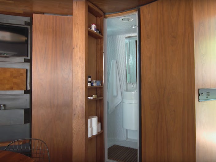 ▼其中一個櫥櫃後面還藏著功能齊全的浴室。門上有置物架,能夠放置一些雜物。