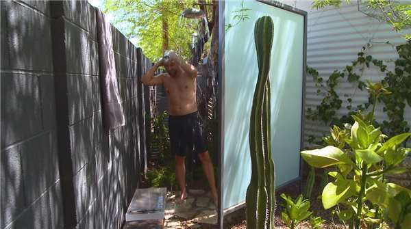 ▼Christoph還在室外設置了一個淋浴間,有牆壁和植物遮擋,能夠保證隱私。