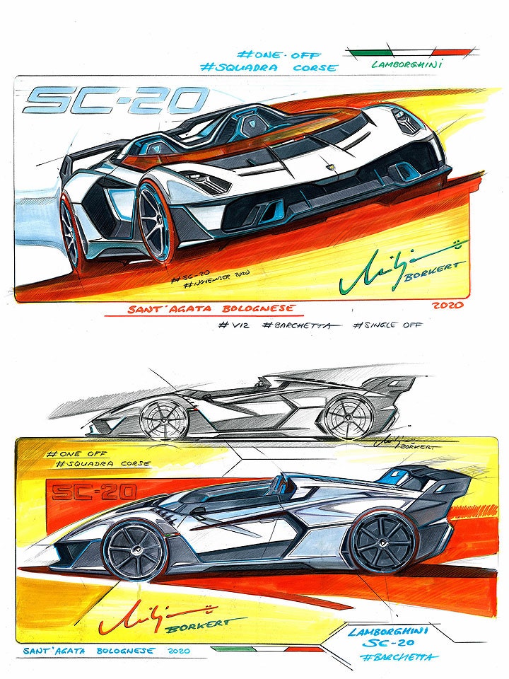 ▼SC20是One-off客製化的產品,據說這位神秘的車主從剛開始繪製設計圖的階段,就已經參與到相關開發與製作中了。車主請Lamborghini Centro Stile設計中心的設計師從Diablo VT Roadster、Aventador J、Veneno Roadster和Concept S等經典車款的設計中汲取靈感,來造出一輛獨一無二的超跑,最終出現在大眾面前的就是這輛霸氣的SC20。