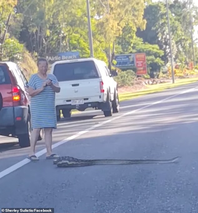 ▼Sherley說:「幸好他們攔下了我,讓我能夠拍到這一幕。那條蟒蛇大概有3公尺長,牠最後安全爬到了馬路另一邊。」