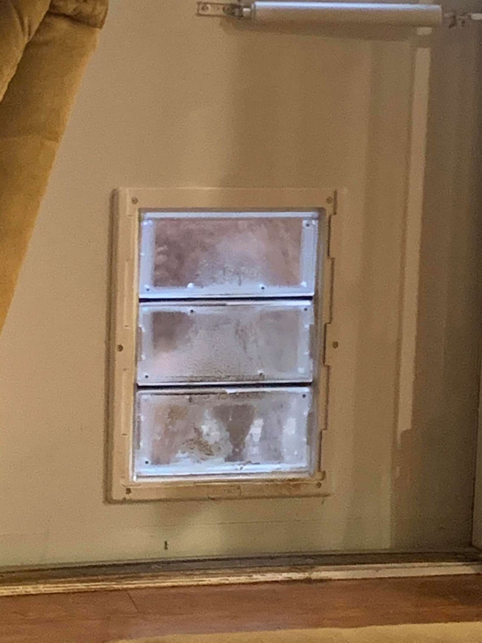 ▼Dakota以前沒用過寵物門,剛開始有點害怕,Cherry就拿出點心引誘牠。Dakota看到點心後立刻有了學習的動力,很快就克服懼怕,學會了寵物門的使用方法。