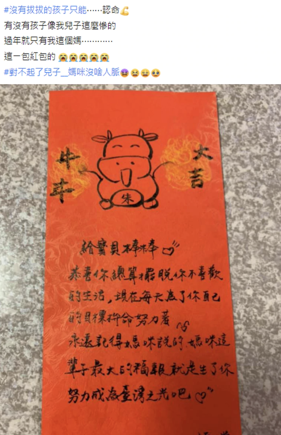 2021年02月17日小孩子過年,最期待的就是領紅包~日前一位單親媽媽在臉書社團「爆怨公社」po文說,自己沒有什麼人脈,兒子過年只收到來自她的紅包。她在紅包袋上寫下給孩子的祝福,表示自己此生最大的福報就是生下他。網友們看到這位媽媽對兒子滿滿的愛都非常感動,直呼:「這一包抵十包!」