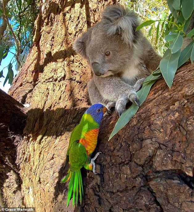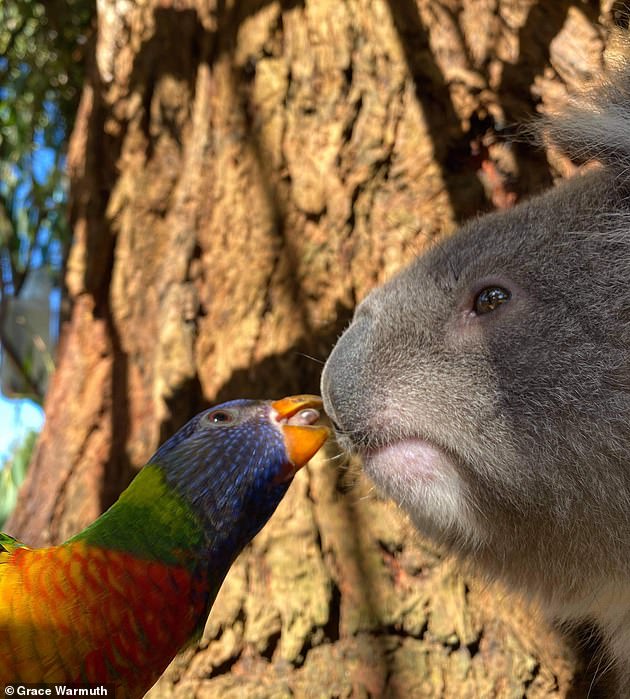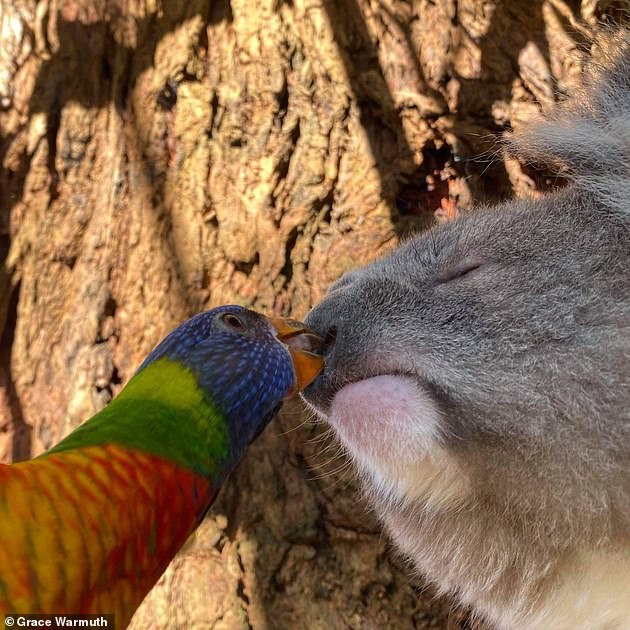 2021年02月21日最近澳洲昆士蘭州野生動物保護區「Mosswood Wildlife」分享了一組可愛的照片。只見一隻羽毛鮮豔的鸚鵡主動親吻一隻小無尾熊,這個溫柔的吻落在了無尾熊的鼻尖上。牠們之間的互動非常有愛,網友們看到照片紛紛表示:「太治癒了!」