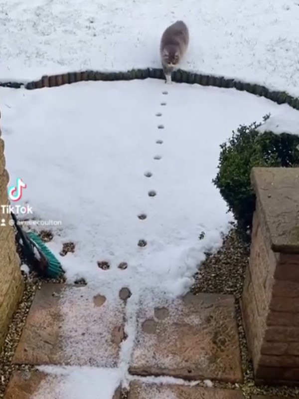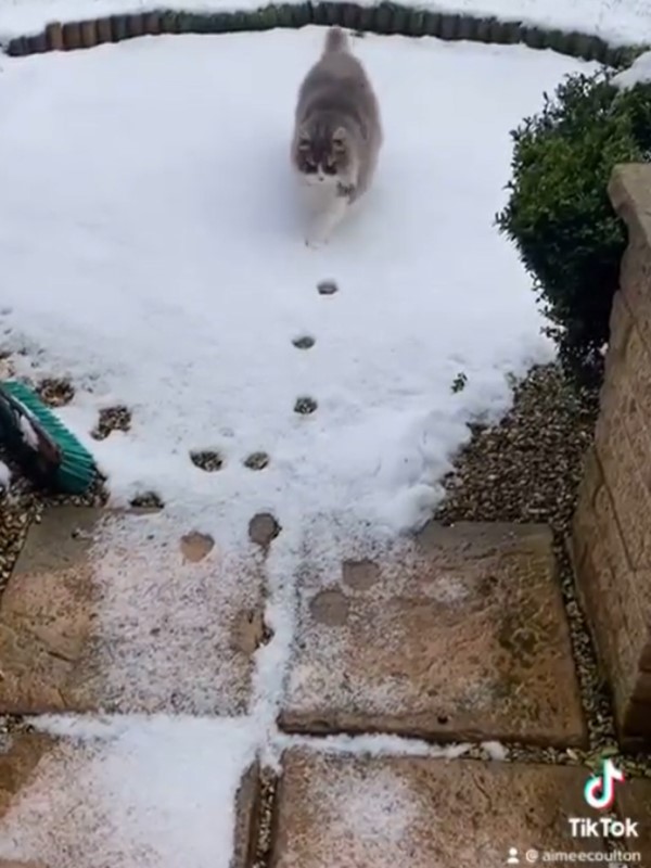 ▼這隻貓咪長著一身蓬松的長毛,身材非常圓潤。飼主Aimee Coulton說,牠平時就很喜歡到花園玩耍,下雪也不能阻擋牠的興致。那天貓咪在外面玩夠準備回家,竟然踩著原本的足跡,精準踏上每一個腳印,悠閒地走了回來。