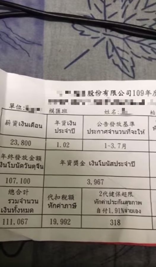 ▼原Po分享泰國移工的年終獎金髮放明細表。從照片中可以看到,這名移工在樹脂模鑄匯流排製造廠工作,年資剛剛1年出頭。他的月薪為23800元 ,但年終獎金有10萬7100元 ,再加上年資獎金3967元 ,一共11萬1067元。扣除代扣稅額19992元 ,二代健保保費318元 ,最後他能領到90757元。