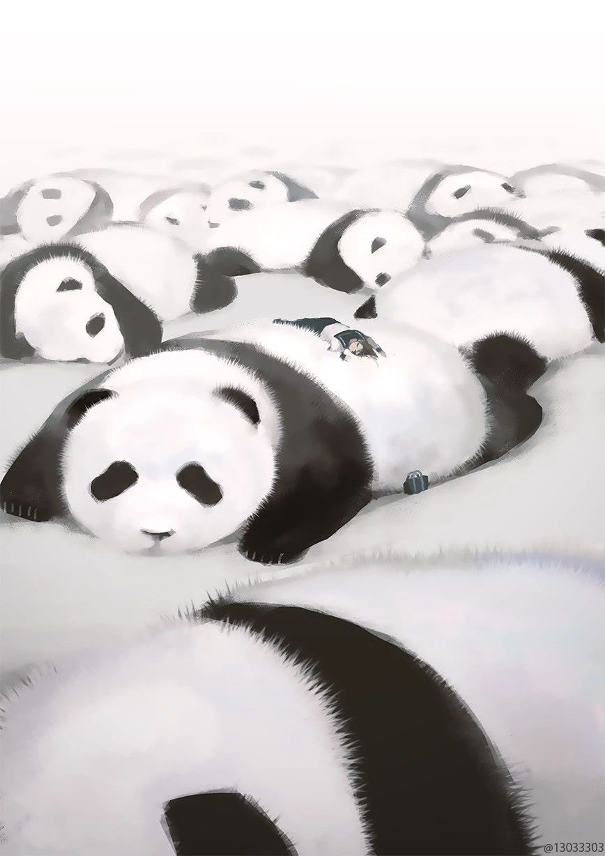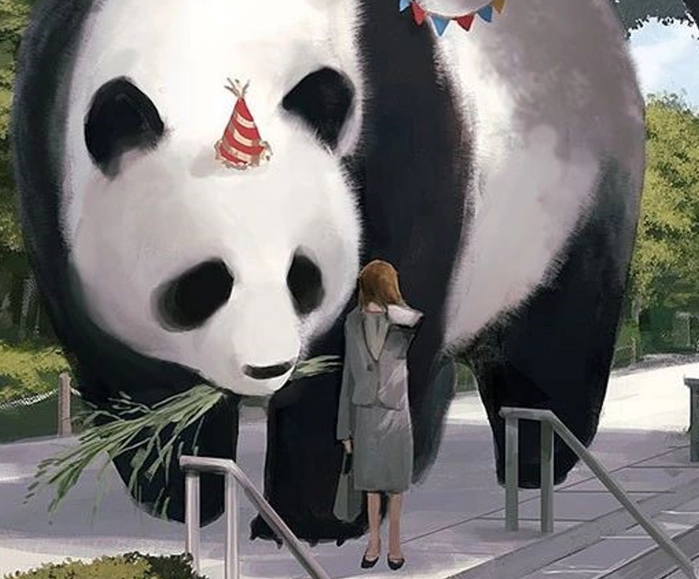 ▼2018年時,もの久保的一幅插畫在網路上走紅。這幅畫的主角是充滿遊樂園色彩的熊貓母子,牠們路過一處台階時,遇到了一個在工作中遭受挫折、心灰意冷的女孩。