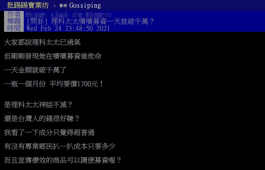 ▼一位網友在PTT的Gossiping板po文說,很多人覺得理科太太已經過氣,但從募資平台上的情況來看,她只花一天就達到募資目標,而且金額破千萬。原PO仔細看過維他命的成分,認為非常普通,和市面上其他的維他命差不多。「是理科太太神話不滅?還是台灣人的錢很好賺?」