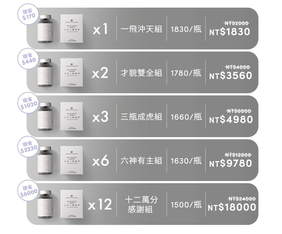 ▼理科太太還在「嘖嘖」上發起群聚集資,推出「理科太太太空人維他命」。其中最便宜的「一飛衝天組」要價1830元,內含一瓶60粒的維他命、成分說明書和感謝卡;最貴的「九十六萬分感謝組」要價13萬7760元。這一群聚資源短短1天就募到1700多萬元,而且還在增長中。贊助者預計於今年5月能取到貨。