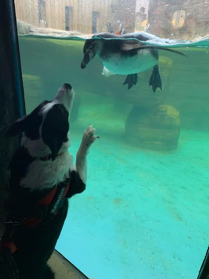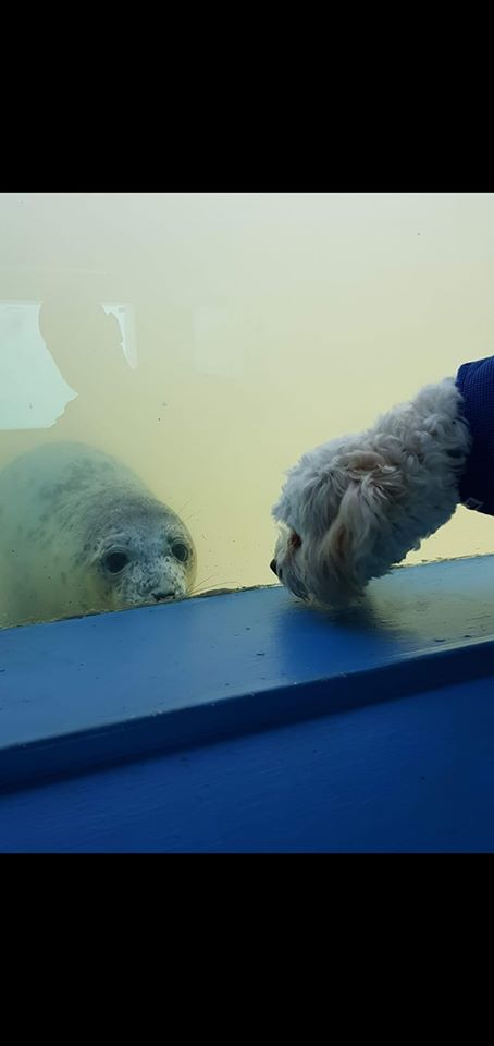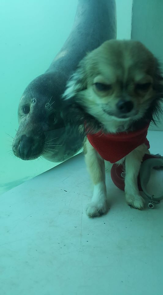 ▼當時天氣比較冷,Melanie就給狗狗穿上了一件藍色的連帽外套,狗狗的耳朵被遮住,從遠處看很像海豹寶寶。大概就是因為這樣,海豹Aayla把牠當成了同類,哪怕隔著玻璃也要跟牠互動。